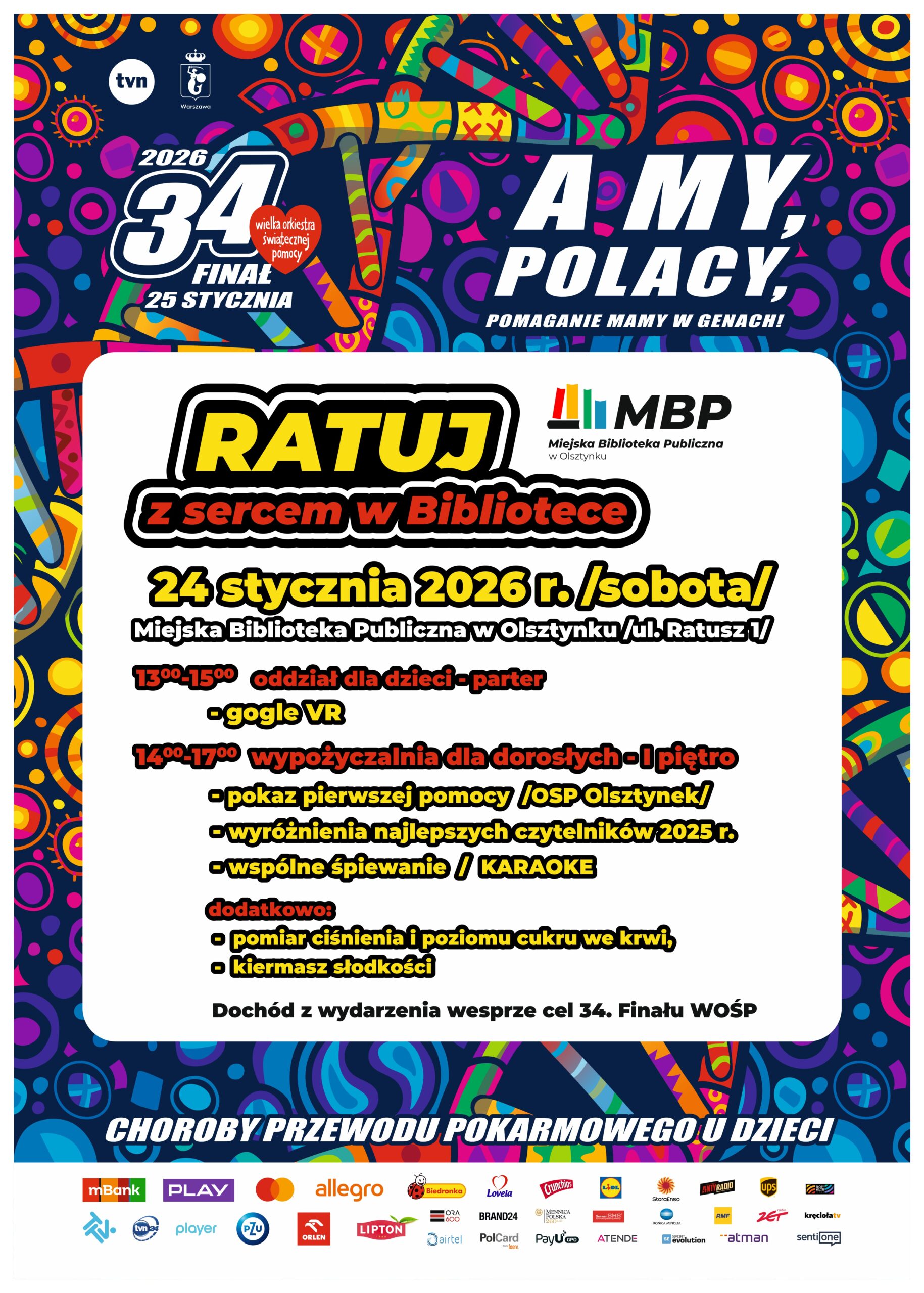 Zapraszamy do Biblioteki na 34 Finał WOŚP połączony z noworocznym spotkaniem z czytelnikami. Wydarzenie odbędzie się w sobotę 24 stycznia.