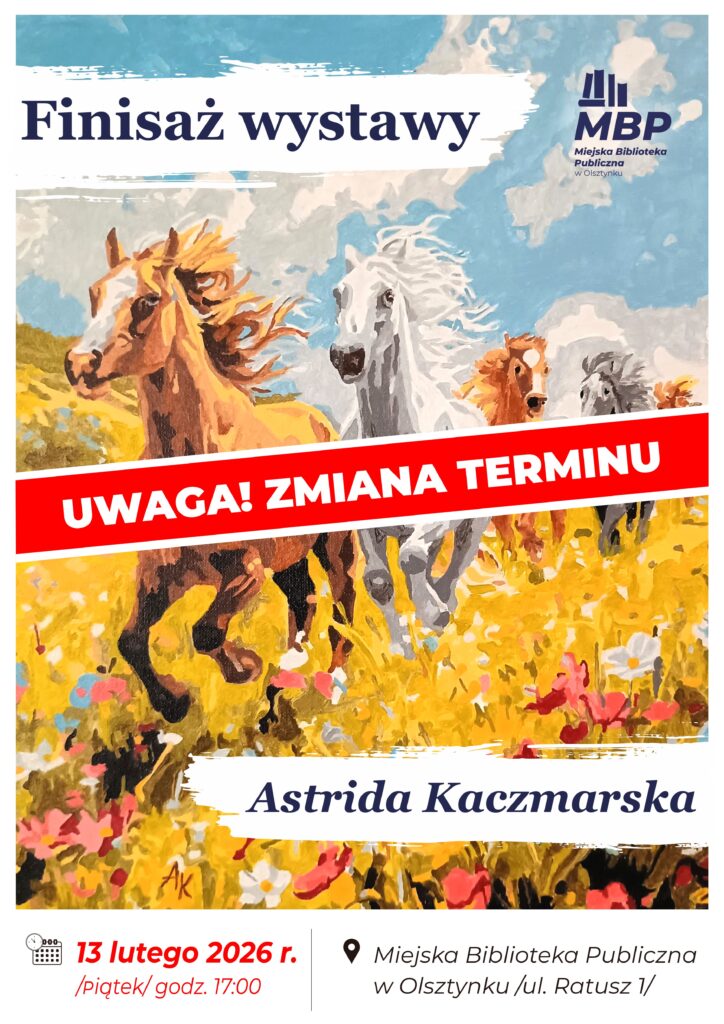 Serdecznie zapraszamy na oficjalne zakończenie wystawy prac malarskich Astridy Kaczmarskiej. Spotkanie odbędzie się 13 lutego (piątek) o godz. 17:00 w wypożyczalni i czytelni dla dorosłych.