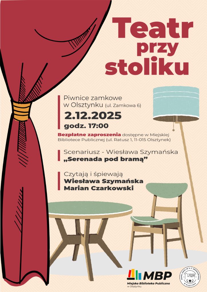 Serdecznie zapraszamy na wyjątkowe wydarzenie – Teatr przy stoliku! Tym razem usłyszymy scenariusz Wiesławy Szymańskiej „Serenada pod bramą”, który zaprezentują aktorzy związani z Teatrem Jaracza w Olsztynie.