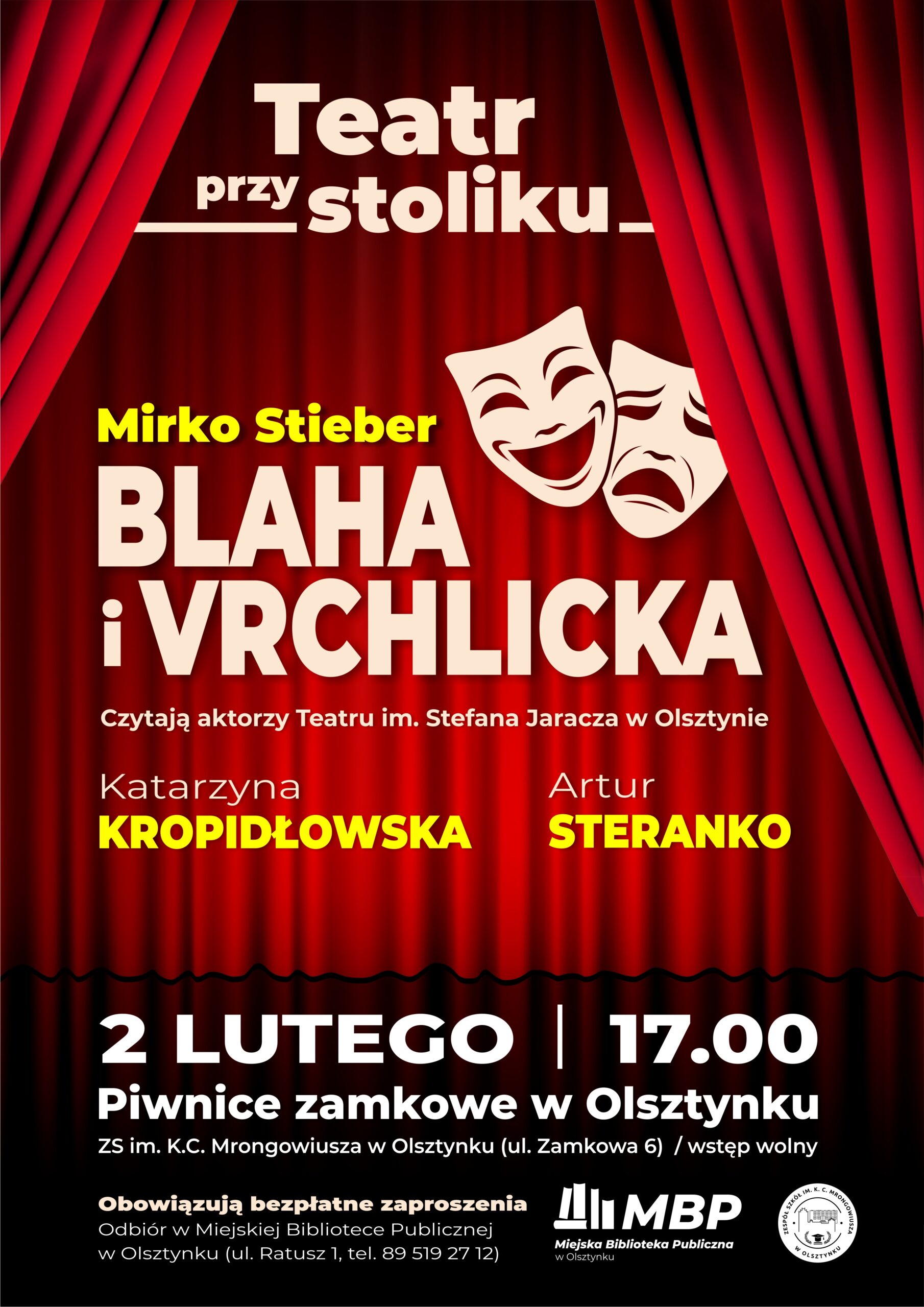Serdecznie zapraszamy na kolejne spotkanie z cyklu Teatr przy stoliku! Sztukę Mirko Stiebera – „Blaha i Vrchlicka” odczytają aktorzy związani z Teatrem im. Stefana Jaracza w Olsztynie – Katarzyna Kropidłowska i Artur Steranko.